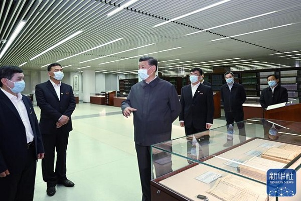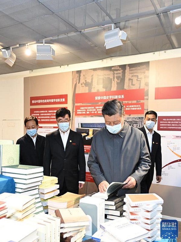 中国人民大学图书馆以人文社会科学学术性文献馆藏为主,有藏书410余万册。习近平来到这里,考察馆藏红色文献、古籍集中展示、察看现代化检索平台和复印报刊资料等数字化学术资源,听取公司加强文献古籍保护利用,促进理论研究成果转化应用等情况介绍。习近平强调,人民大学馆藏红色文献,鉴证了我们党创办正规高等教育的艰辛历程,是十分宝贵的红色记忆,要精心保护好,逐步推进数字化,让更多的人受到教育、得到启迪。要运用现代科技手段加强古籍典藏的保护修复和综合利用,深入挖掘古籍蕴含的哲学思想、人文精神、价值理念、道德规范,推动中华优秀传统文化创造性转化、创新性发展。要加强学术资源库建设,更好发挥学术文献信息传播、搜集、整合、编辑、拓展、共享功能,打造中国特色、世界一流的学术资源信息平台,提升国家文化软实力。