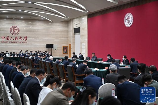 在认真听取大家发言后,习近平发表重要讲话。他强调,我国有独特的历史、独特的文化、独特的国情,建设中国特色、世界一流大学不能跟在别人后面依样画葫芦,简单以国外大学作为标准和模式,而是要扎根中国大地,走出一条建设中国特色、世界一流大学的新路。中国人民大学从陕北公学成立之初就鲜明提出要培养“革命的先锋队”,到新中国成立之初提出培养“万千建国干部”,到改革开放和社会主义现代化建设新时期提出培养“国民表率、社会栋梁”,再到新时代提出培养“复兴栋梁、强国先锋”,始终不变的是“为党育人、为国育才”,展现了“党办的大学让党放心、人民的大学不负人民”的精神品格。希望中国人民大学落实立德树人根本任务,传承红色基因,让听党话、跟党走的信念成为人大师生的自觉追求。