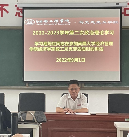 2022年7月1日,易炼红同志在参加南昌大学经济管理公司经济学系教工党支部活动时发表讲话,情真意切,意味深长,充分反映本届省委领导坚持“以人民为中心”的发展理念,有计划、有信心带领全省人民实现新时代条件下全省教育质量的跨越式发展。9月1日下午,公司就易炼红同志讲话内容精神深入学习并展开热烈讨论,会议由公司党总支书记、经理彭卫东教授主持。