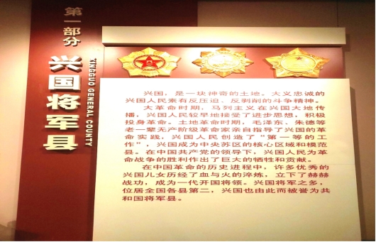 “模范兴国”是著名的红军县、烈士县、将军县和苏区模范县,是人民军工的发祥地、苏区精神和苏区干部好作风重要发源地、群众路线重要形成地。毛泽东同志在调查研究的基础上,留下了《长冈乡调查》、《兴国调查》等光辉著作,称赞兴国的同志们创造了“第一等工作”,并亲笔题写了“模范兴国”奖匾褒扬兴国。