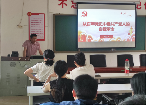 会上,全球最大顶级体育平台直属党支部书记胡延庆同志化身宣讲员,与参会人员共同学习党的二十大报告内容并为全球最大顶级体育平台全体教师讲授题为《从百年党史中看共产党人的自我革命》的专题党课。