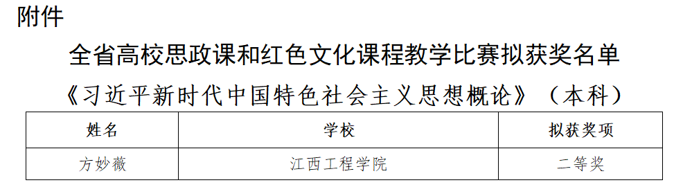 近日,江西省教育厅发布了《关于全省高校思政课和红色文化课程教学比赛结果的公示》,根据公示名单,公司全球最大顶级体育平台教师方妙薇荣获《习近平新时代中国特色社会主义思想概论》课(本科组)二等奖。